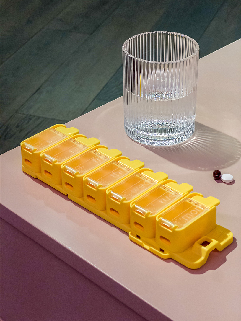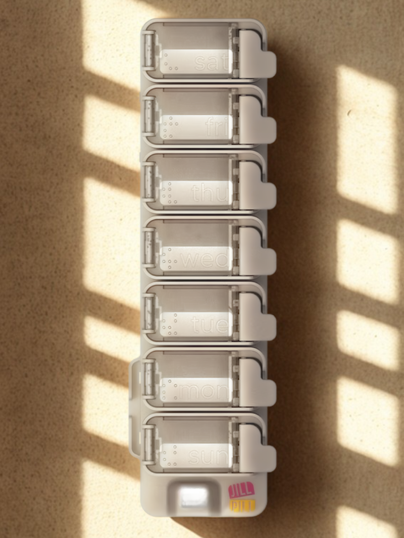 A lockable modular pillbox designed by a pharmacist to make medication management stylish, accessible and spill-proof. The innovative design features customisable compartments that click together or apart, wearable options, and tactile braille bumps for accessibility. Available in three vibrant colours, Jill Pill transforms daily medication routines into a more organised and enjoyable experience.